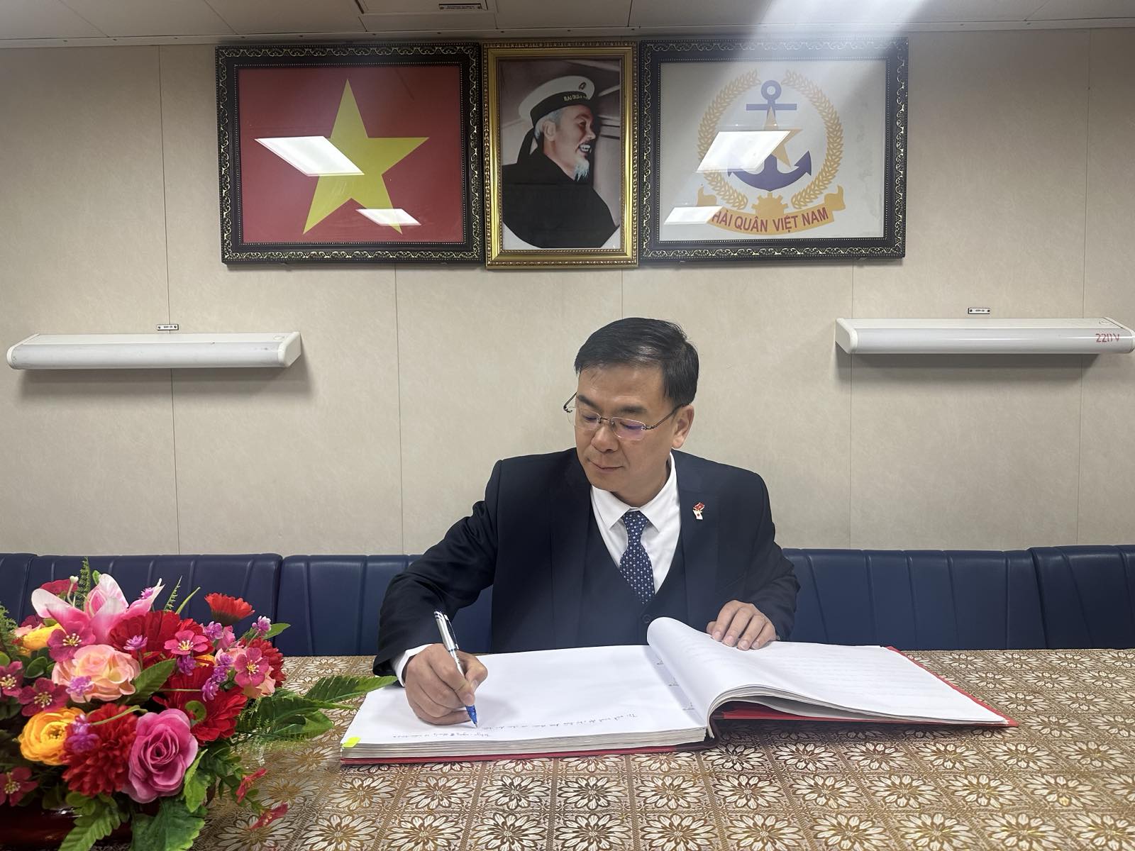 大使が艦を視察し、015号艦「チャン・フン・ダオ」の伝統記録簿に記帳
